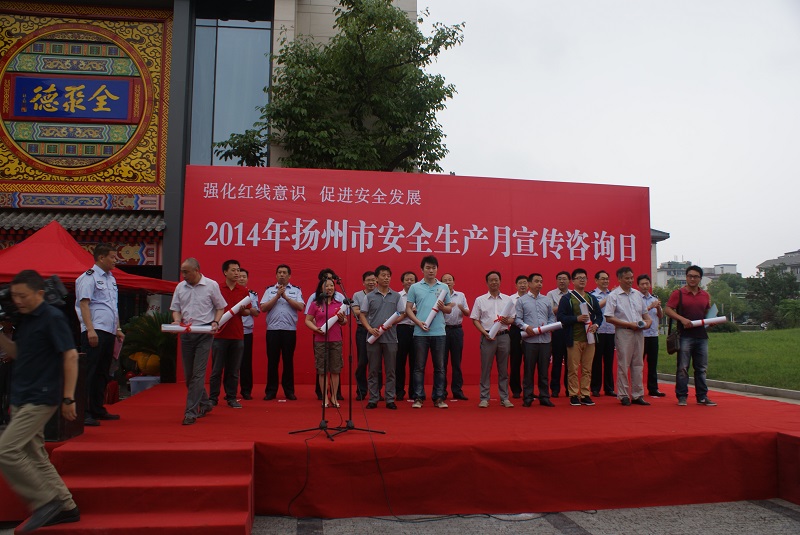 6月16日上午,揚州市安委辦會同蜀崗—瘦西湖風景名勝區(qū)管委會在虹橋坊舉行了以“強化紅線意識,促進安全發(fā)展”為主題的2014年揚州市“安全生產月”宣傳咨詢日活動。市安委會、市安監(jiān)局、蜀岡—瘦西湖風景名勝區(qū)管委會、市人保公司負責人出席了活動。市安監(jiān)局、揚汽集團、市城建控股集團、市工藝美術集團、金茂化工集團、揚子江集團、建工控股集團等11家單位以及消防、建筑、燃氣、氣象、質監(jiān)、部分駐揚單位的職工代表共計400余人參加了活動。