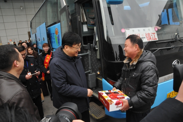 在發(fā)車區(qū),丁市長來到揚(yáng)州至鎮(zhèn)江的班車旁,給駕駛員師傅送上了象征平安吉祥的大蘋果,并叮囑駕駛員師傅,一定要注意安全,要將旅客平安送到他們的親人身邊。